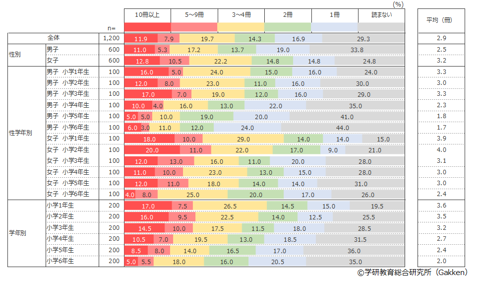 調査結果をみると、小学生全体では1か月に平均2.9冊読んでいることがわかる。これは2014年度調査の平均5.6冊と比較すると、約半分の冊数である。学年別で最も多いのは小学1年生の3.6冊で、男女ともに学年が上がるにつれて読書冊数は減少傾向にあり、小学6年生では2.0冊となる。