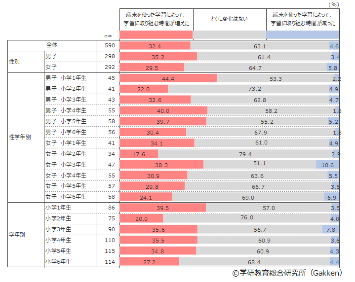 「端末を使った学習によって、学習に取り組む時間が増えた」と答えたのは全体の32.4%、「特に変化がない」は63.1%、「学習に取り組む時間が減った」は4.6%であった。「学習に取り組む時間が増えた」割合を男女別にみると、男子で35.2%、女子で29.5%と、いずれの学年においても男子の方が「学習に取り組む時間が増えた」割合が高い傾向にあった。