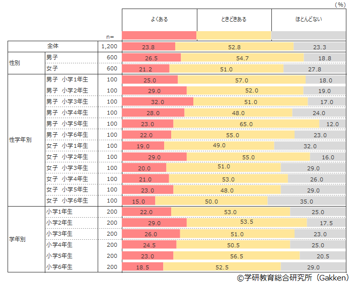 全体の結果をみると、家で学習に集中できないことが「よくある」(23.8%)と「ときどきある」(52.8%)を合わせて76.6%と高い数値となった。男女別にみると、男子81.2%・女子72.2%となっており、男子の方が集中できないと感じる割合がやや高い傾向にあるようだ。