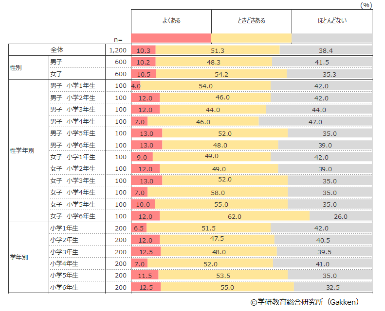 学年別では、男女ともに学年が上がるほど「よくある」「ときどきある」と答える割合が高くなっている。高学年になると成長とともに人間関係が複雑になるのか、自己主張を控える傾向にあるようだ。