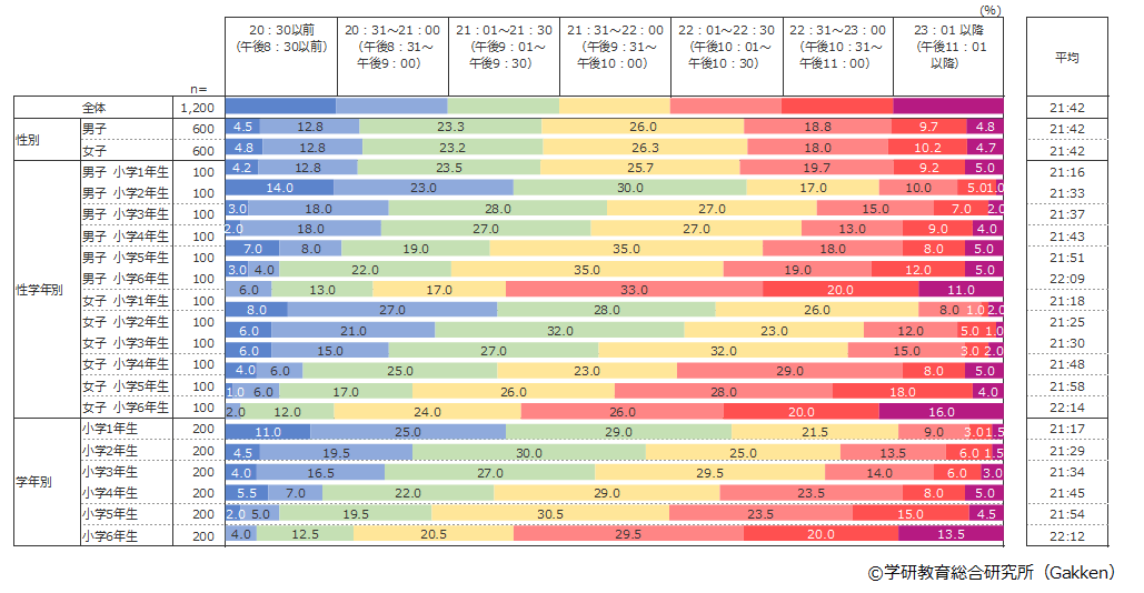全学年の平均就寝時刻は21:42で、2020年調査時(21:42)や2021年調査時(21:40)と比較しても、大きな変化はみられなかった。時間ごとの分布や学年ごとの傾向にも変化はみられず、学年が上がるにつれて就寝時刻が遅くなる傾向も変わっていない。