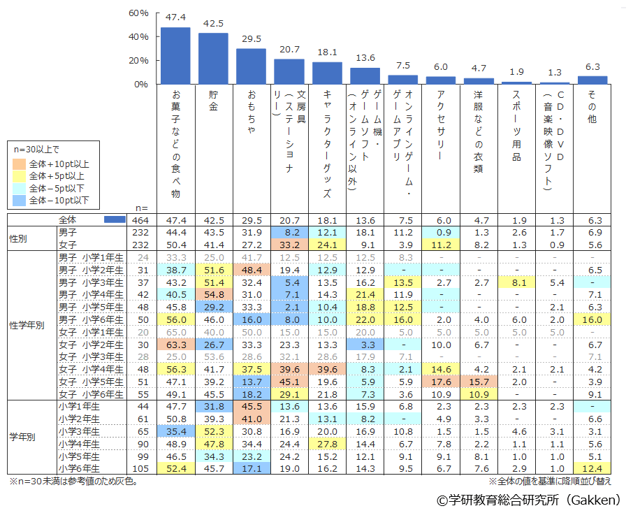 学年別にみると「おもちゃ」の率は学年が上がるにつれて減ってゆく傾向は例年と変わらない。「ゲーム機・ゲームソフト(オンライン以外)」の率は学年での変動はさほど見られないが、中学年以上の男子と女子で見比べると顕著な差異が見てとれる。男子は中学年以上のほうが率が上がるが、女子はむしろこのカテゴリにはお金を使わないようになっていく。
