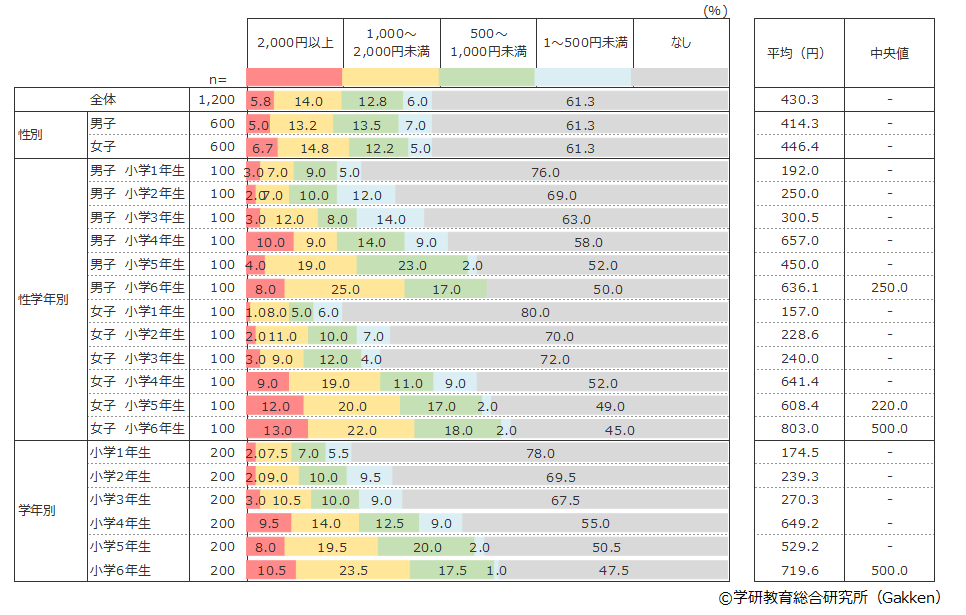 毎月使えるおこづかいの金額は平均で430.3円。過去3年の平均値472.0円を下回る額となった。ただ毎月おこづかいをもらっている子どもの率は38.7%と、過去3年とほぼ変わらず4割弱である。学年が上がるにつれてもらえる率と額が上昇する傾向も過去と変わらないようだ。