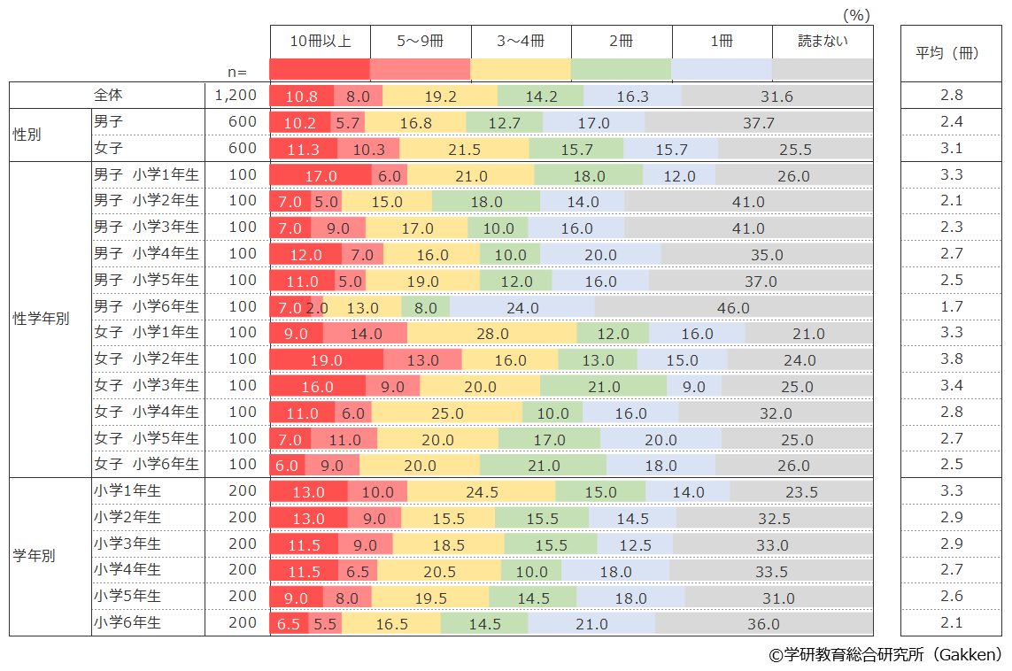 現在の形式で調査を始めた2014年以降、例外もありつつもほぼ毎年減少している月の読書量だが、今回も最低冊数を更新した。月の平均読書量は2.8冊、10冊以上読む子どもの割合は10.8%と、こちらも過去最低の数値となった。一方、1冊も「読まない」子どもの割合は31.6%と調査史上初の30%超えとなり、全体の読書量の低減が明らかになった。