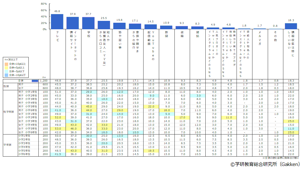 全体ランキングは、1位「テレビ」(46.8%)、2位「インターネットの情報サイト」(37.9%)、3位「学校」(37.7%)、4位「知人や保護者友人(ママ友)からの口コミ」(25.5%)、5位「塾や習い事」(19.8%)の順だった。