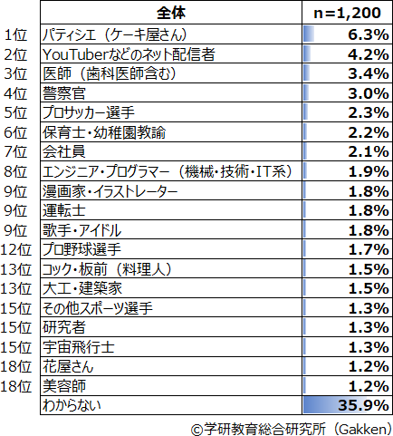 男女合計の全体ランキングをみると、1位「パティシエ(ケーキ屋さん)」(6.3%)、2位「YouTuberなどのネット配信者」(4.2%)、3位「医師(歯科医師含む)」(3.4%)となり、昨年の上位3位と同様であった。