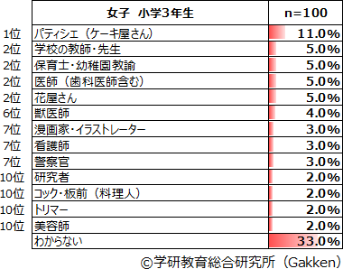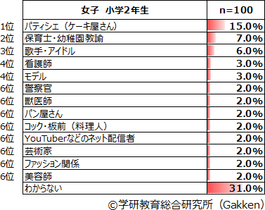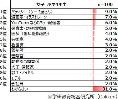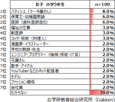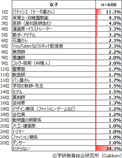 女子の全体ランキングは1位「パティシエ(ケーキ屋さん)」(11.3%)、2位「保育士・幼稚園教諭」(4.3%)、3位「医師(歯科医師含む)」(4.0%)となった。男子のトップ20のランキングと比較すると、共通する職業は「YouTuberなどのネット配信者」「警察官」「パティシエ(ケーキ屋さん)」「コック・板前(料理人)」のみで、2021年調査と比べると共通する職業が減っている。
