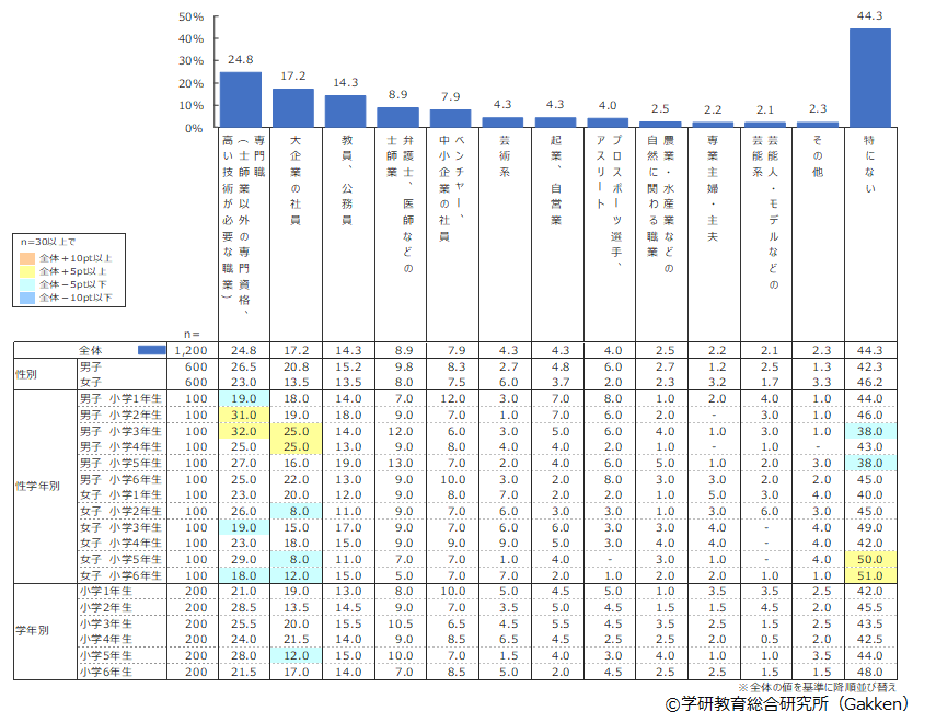男女別でみると、「大企業の社員(男子20.5%、女子13.5%)」「芸術系(男子2.7%、女子6.0%」「プロスポーツ選手、アスリート(男子6.0%、女子2.0%)」で差がみられた。