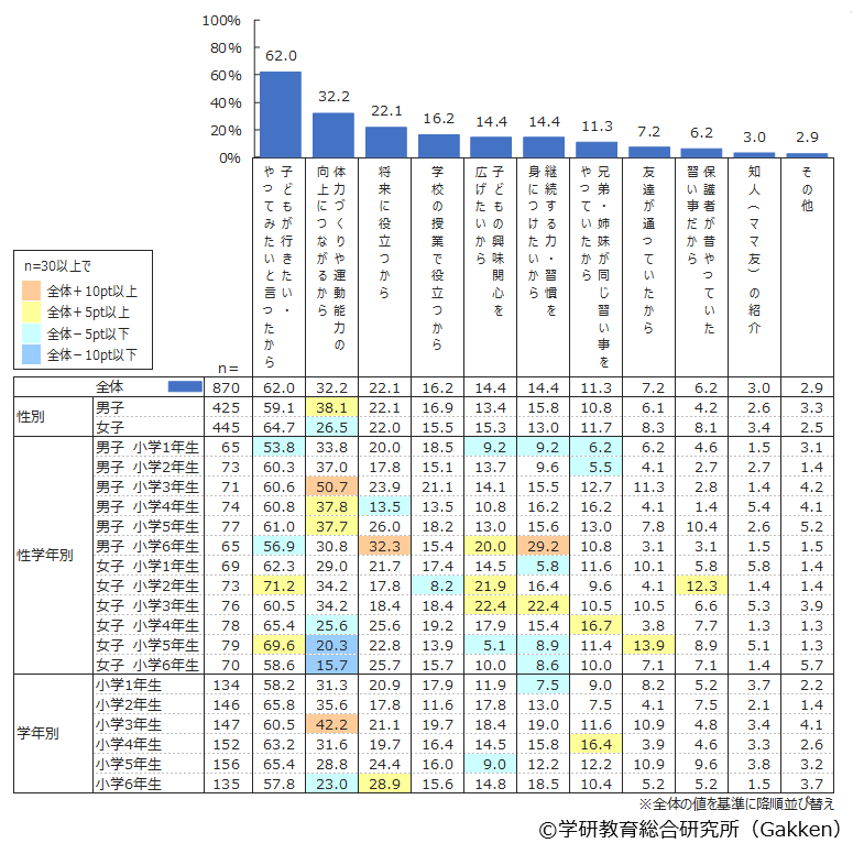 2番目に多かったのは「体力づくりや運動能力の向上につながるから」で32.2%だった。小学生にもっとも人気な習い事が「水泳」だったことからも納得の結果である。男女別にみると、小学生男子は38.1%、小学生女子は26.5%と、女子に比べて男子の割合が高かった。さらに学年別にみると、小学3~5年生の男子は「体力づくり」を理由に習い事を始める割合が特に高かった。