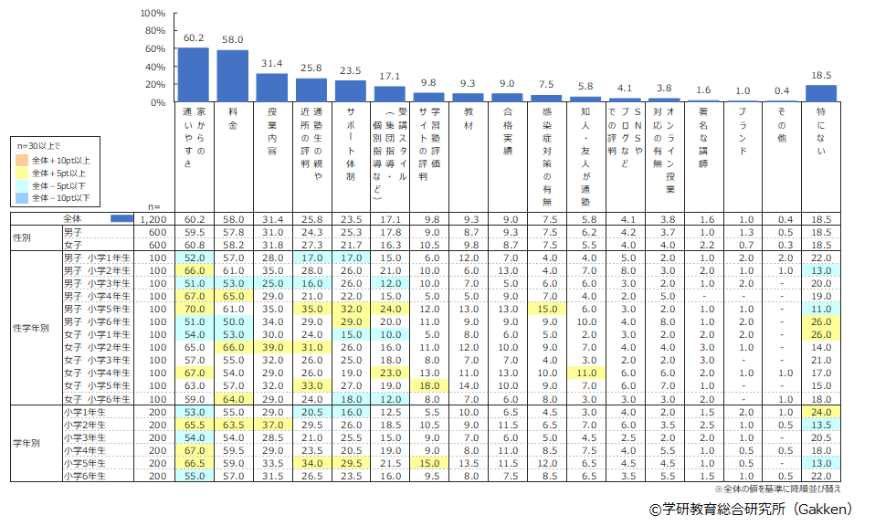 1位は「家からの通いやすさ」60.2%。男女に大差はなく、家から近い、あるいは通いやすい立地を重視している傾向にある。学年別でみると小学4年生が最も高く、67.0%あり、最も低いのが小学1年生の53.0%という結果であった。特に送迎せずに通塾する小学4、5年生くらいになると一人で通塾する機会が増えるためか、より立地が塾選びのポイントになっているようだ。