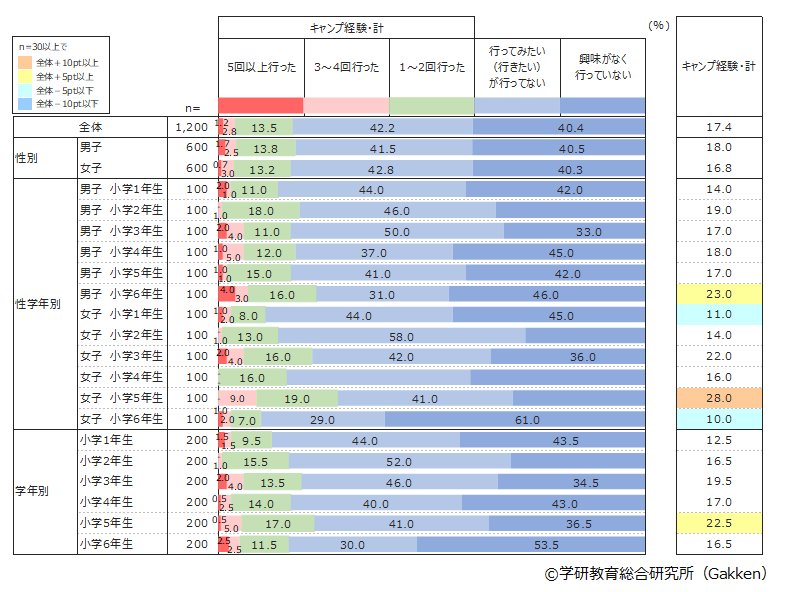 「行ってみたいが行っていない」は小学生全体では42.2%あり、経験した小学生17.4%と合わせると、59.6%で約6割となる。この割合は男女でほとんど変わらない。この59.6%をキャンプに関心のある小学生とすると、実際に経験しているのは17.4%なので、関心のある層の29.2%、約3割が実際キャンプに行っていることになる。