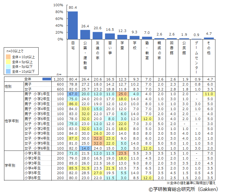 保護者に聞いた小学生の放課後の遊び場として「自宅」と回答した保護者が80%以上いることがわかった。複数回答可能な質問ではあるが、2位の「公園・運動場」(26.4%)と3倍以上の大きな差がつく結果となり、学年や男女を問わず、放課後に「自宅」で過ごす機会が多いことがうかがえる。