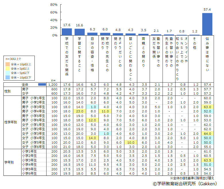 まず注目すべきは、「悩み事は特にない」と答えた割合が57.4%にのぼることだ。特に小学3年生は男女共に60%超の子どもたちが、「悩み事は特にない」と回答をしている。