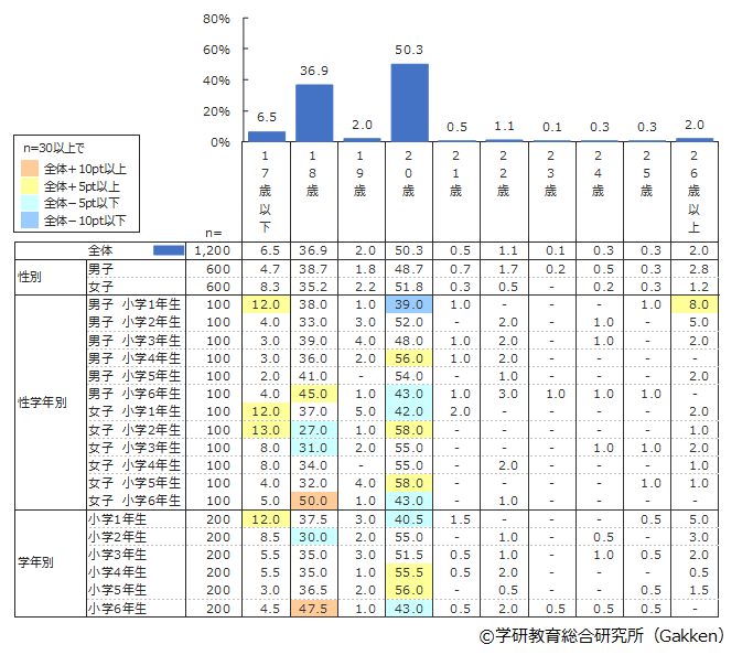 約半数(50.3%)の子どもが、「20歳」と回答、次いで36.9%が、「18歳」と回答している。