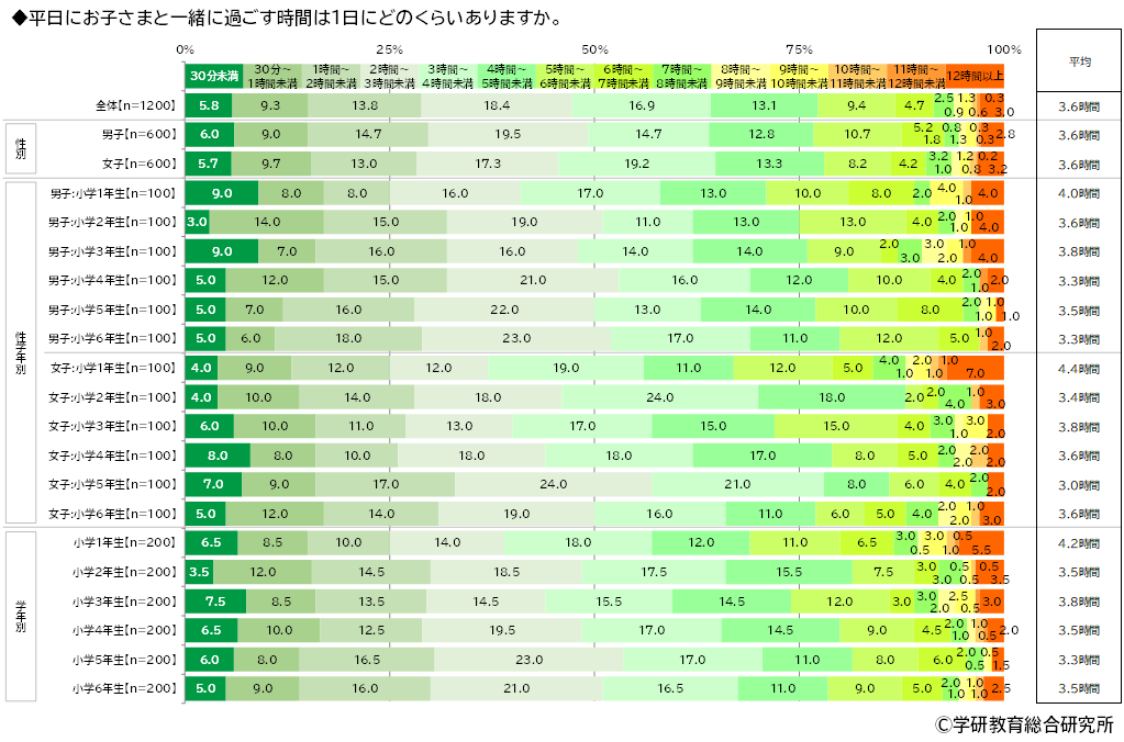 保護者に、平日に子どもと一緒に過ごす時間は1日にどのくらいあるかをきいたところ、「2時間~3時間未満」(18.4%)や「3時間~4時間未満」(16.9%)に回答が集まり、平均は3.6時間でした。また、「1時間未満」は15.0%という結果になりました。