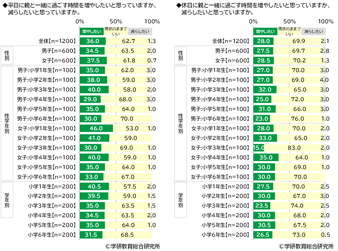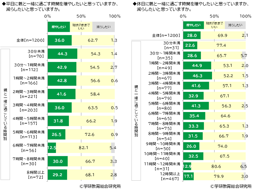 親と一緒に過ごす時間を増やしたいと思うか、減らしたいと思うかきいたところ、【平日】では「増やしたい」は36.0%、「現状のままでいい」は62.7%、「減らしたい」は1.3%となりました。