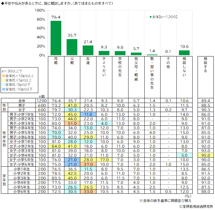 不安や悩みがあるときに、誰に相談するかをきいたところ、「母親」(76.4%)が突出して高くなり、「父親」(35.7%)、「友達」(21.4%)と続きました。不安やストレスを感じていることや人に伝えづらい悩みがあるときには、まずは母親に相談しているという人が大半を占めました。また、「相談しない」は10.6%、相談する人の割合は89.4%となりました。