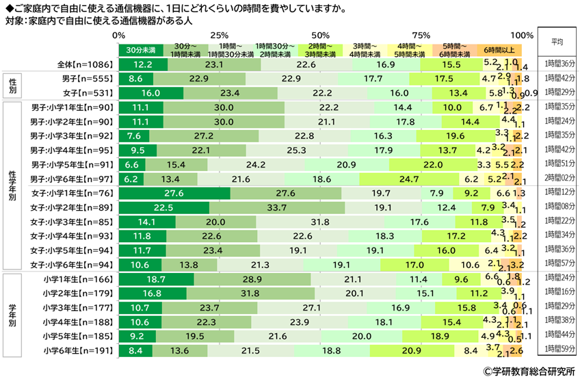 家庭内で自由に使える通信機器がある人(1,086名)に、1日にどれくらいの時間を費やしているかきいたところ、「30分~1時間未満」(23.1%)と「1時間~1時間30分未満」(22.6%)に多くの回答が集まり、平均は1時間36分でした。 学年別にみると、通信機器に費やす時間の平均は、高学年ほど長くなる傾向がみられ、6年生では1時間59分でした。