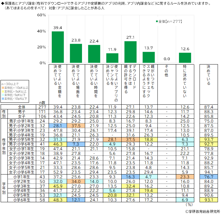 アプリに課金したことがある人(277名)に、保護者とアプリ課金(有料でダウンロードできるアプリや定額制のアプリの利用、アプリ内課金など)に関するルールを決めているかきいたところ、「使ってよい金額を決めている」(39.4%)が最も高くなり、「ダウンロードするときは親の許可を得る」(27.1%)、「使ってよい場面を決めている」(23.8%)が続き、「決めている」は87.4%、「特に決めていない」は12.6%となりました。