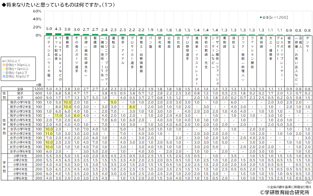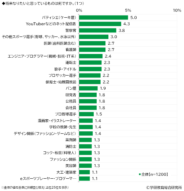 将来なりたいと思っているものをきいたところ、1位「パティシエ(ケーキ屋)」(5.0%)、2位「YouTuberなどのネット配信者」(4.3%)、3位「警察官」(3.8%)となりました。
