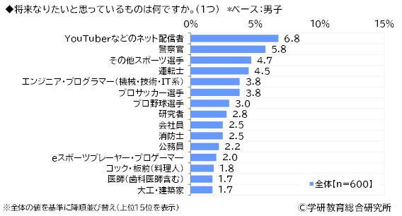男子についてみると、1位「YouTuberなどのネット配信者」(6.8%)、2位「警察官」(5.8%)、3位「その他スポーツ選手(野球、サッカー、水泳以外)」(4.7%)となりました。