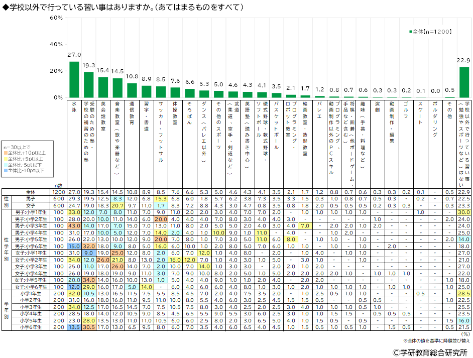 学校以外で行っている習い事をきいたところ、1位「水泳」(27.0%)、2位「受験のための塾・学校の補習のための塾」(19.3%)、3位「英会話教室」(15.4%)、4位「音楽教室(歌や楽器など)」(14.5%)、5位「通信教育」(10.8%)となり、「学校以外で行っている習い事(勉強やスポーツなど)はない」は22.9%でした。