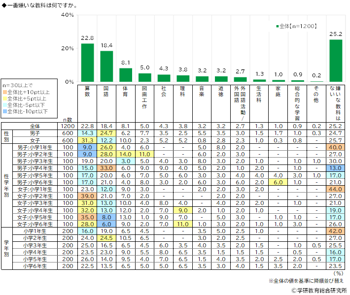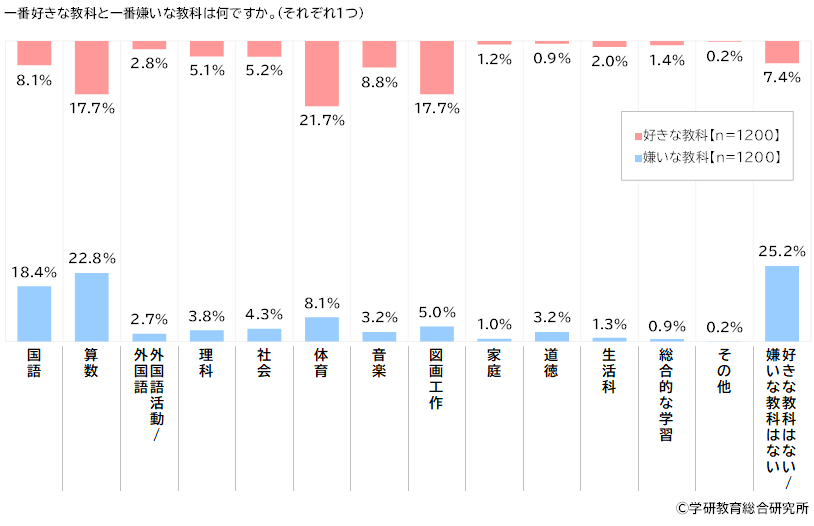 他方、一番嫌いな教科をきいたところ、1位「算数」(22.8%)、2位「国語」(18.4%)、3位「体育」(8.1%)、4位「図画工作」(5.0%)、5位「社会」(4.3%)となりました。