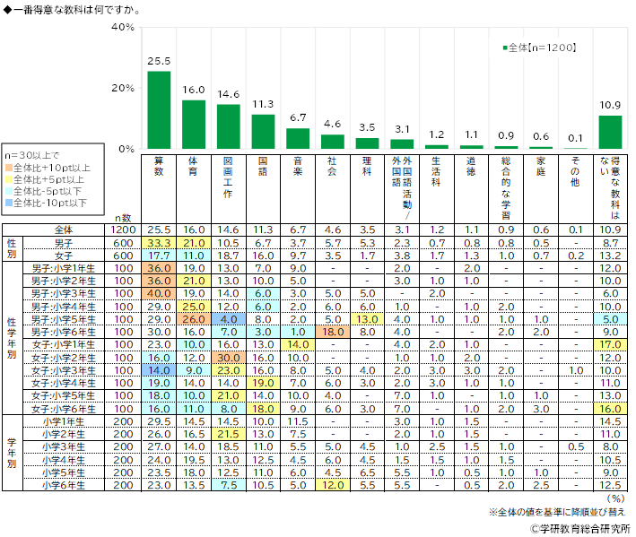 一番得意な教科をきいたところ、1位「算数」(25.5%)、2位「体育」(16.0%)、3位「図画工作」(14.6%)、4位「国語」(11.3%)、5位「音楽」(6.7%)となりました。