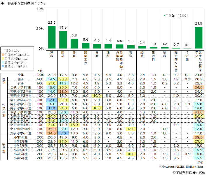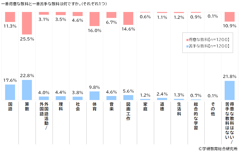 他方、一番苦手な教科をきいたところ、1位「算数」(22.8%)、2位「国語」(17.6%)、3位「体育」(9.8%)、4位「図画工作」(5.6%)、5位「音楽」(4.6%)と、“一番得意な教科”と同じ教科がTOP5に挙がりました。