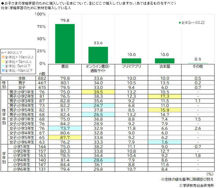 また、子どもの家庭学習のために教材を購入している保護者(882名)に、家庭学習のために購入している本を主にどこで購入しているかをきいたところ、「書店」(79.8%)がダントツとなり、「オンライン書店・通販サイト」(33.6%)、「フリマアプリ」「古本屋」(いずれも10.0%)と続きました。実店舗だけでなくオンラインで購入している人も少なくないようです。
