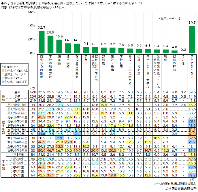 子どもが中学校受験を希望している人(428名)に、子ども自身が受験する中学校を選ぶ際、重視したいことをきいたところ、1位「自宅からの距離」(32.7%)、2位「学校の教育方針」(25.5%)、3位「偏差値」(19.6%)、4位「進学実績」(14.3%)、5位「在校生の雰囲気」(14.0%)となりました。3年生以下では、ほぼ半数が「まだわからない」と回答していますが、6年生になると「まだわからない」が18.8%と特に低くなっています。