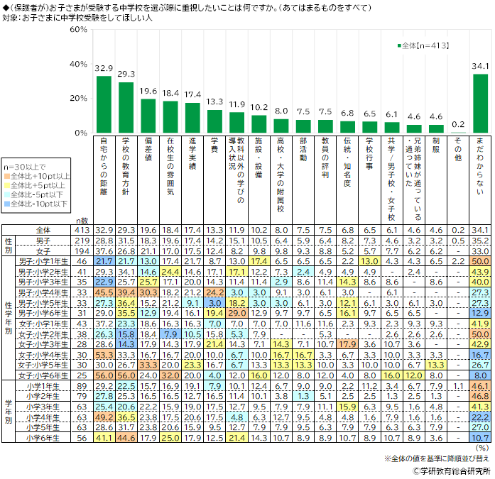 他方、子どもに中学校受験をしてほしい保護者(413名)に、子どもが受験する中学校を選ぶ際に重視したいことをきいたところ、1位「自宅からの距離」(32.9%)、2位「学校の教育方針」(29.3%)、3位「偏差値」(19.6%)、4位「在校生の雰囲気」(18.4%)、5位「進学実績」(17.4%)となりました。