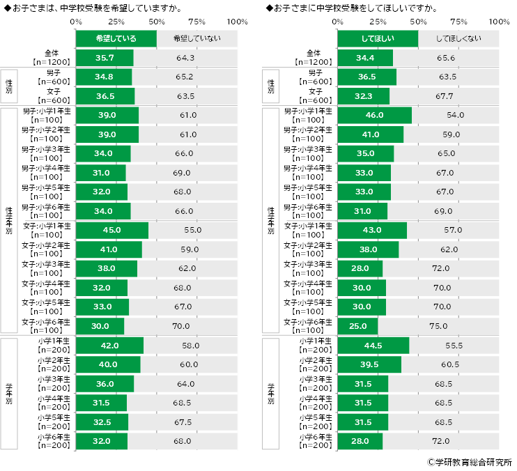 他方、保護者に対し、子どもに中学校受験をしてほしいかをきいたところ、「してほしい」は34.4%、「してほしくない」は65.6%となりました。