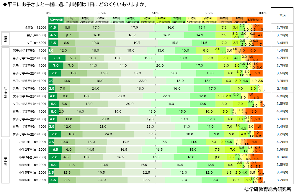 保護者に、平日に子どもと一緒に過ごす時間は1日にどのくらいあるかをきいたところ、「1時間~2時間未満」(17.9%)や「2時間~3時間未満」(17.9%)、「3時間~4時間未満」(16.0%)に回答が集まり、平均は3.7時間でした。