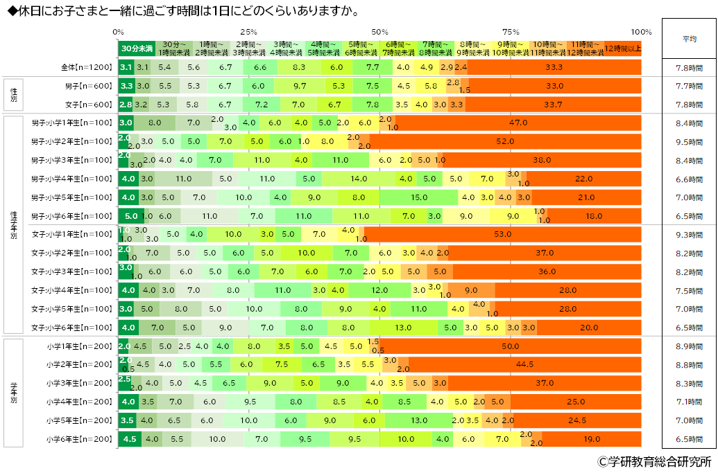 また、保護者に、休日に子どもと一緒に過ごす時間は1日にどのくらいあるかをきいたところ、「12時間以上」(33.3%)に多くの回答が集まり、平均は7.8時間でした。