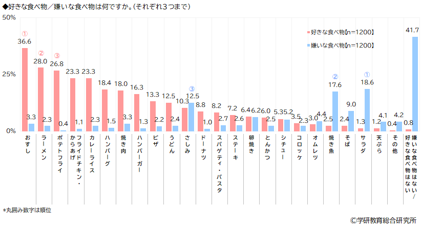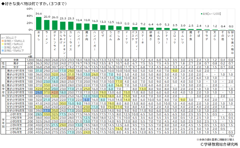 好きな食べ物をきいたところ、1位「おすし」(36.6%)、2位「ラーメン」(28.0%)、3位「ポテトフライ」(26.8%)となりました。