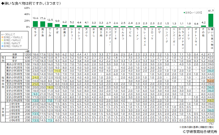他方、嫌いな食べ物をきいたところ、1位「サラダ」(18.6%)、2位「焼き魚」(17.6%)、3位「さしみ」(12.5%)となりました。