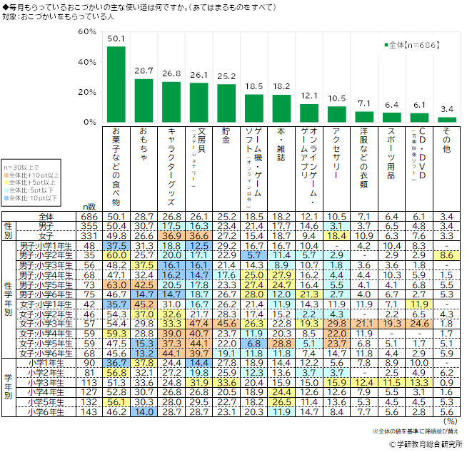 おこづかいをもらっている人(686名)に、毎月もらっているおこづかいの主な使い道をきいたところ、1位「お菓子などの食べ物」(50.1%)、2位「おもちゃ」(28.7%)、3位「キャラクターグッズ」(26.8%)となりました。