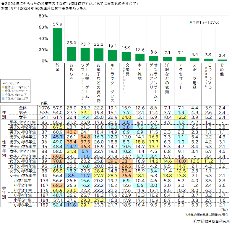今年(2024年)のお正月にお年玉をもらった人(1,076名)に、もらったお年玉の主な使い道をきいたところ、「貯金」(57.9%)が突出して高くなり、2位「おもちゃ」(25.0%)、3位「ゲーム機・ゲームソフト(オンライン以外)」(23.2%)と続きました。