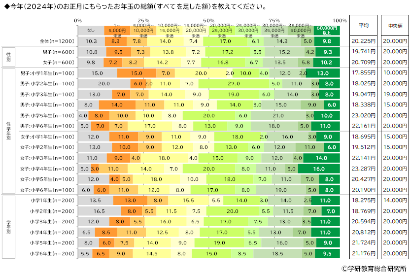 今年(2024年)のお正月にもらったお年玉の総額(すべてを足した額)をきいたところ、お年玉をもらった人の割合は89.7%(「なし」が10.3%)となり、平均は20,225円でした。