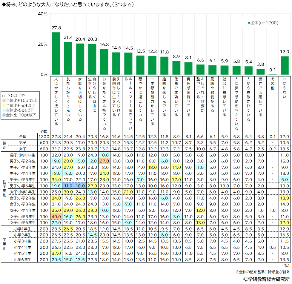 将来、どのような大人になりたいと思っているかをきいたところ、1位は「人にやさしく接している」(27.8%)でした。次いで、2位「友だちがたくさんいる」(21.4%)、3位「家族を大切にしている」(20.4%)、4位「自分らしく自由に生きている」(20.3%)、5位「お金をたくさん持っている」(16.8%)となりました。