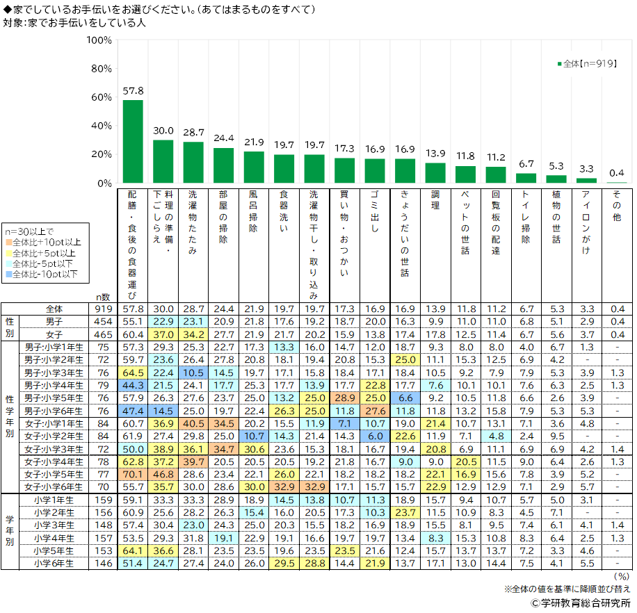 家でお手伝いをしている人(919名)に、家でしているお手伝いをきいたところ、「配膳・食後の食器運び」(57.8%)が最も高くなりました。お手伝いとして、盛り付けが終わった食器を食卓に運んだり、食べ終わった食器を片付けたりしている人が多いようです。次いで高くなったのは、「料理の準備・下ごしらえ」(30.0%)、「洗濯物たたみ」(28.7%)、「部屋の掃除」(24.4%)、「風呂掃除」(21.9%)でした。