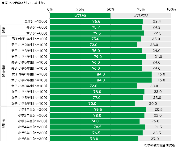 家でお手伝いをしているかをきいたところ、「している」は76.6%、「していない」は23.4%と、小学生の多くが家庭で何らかのお手伝いを行っていることがわかりました。