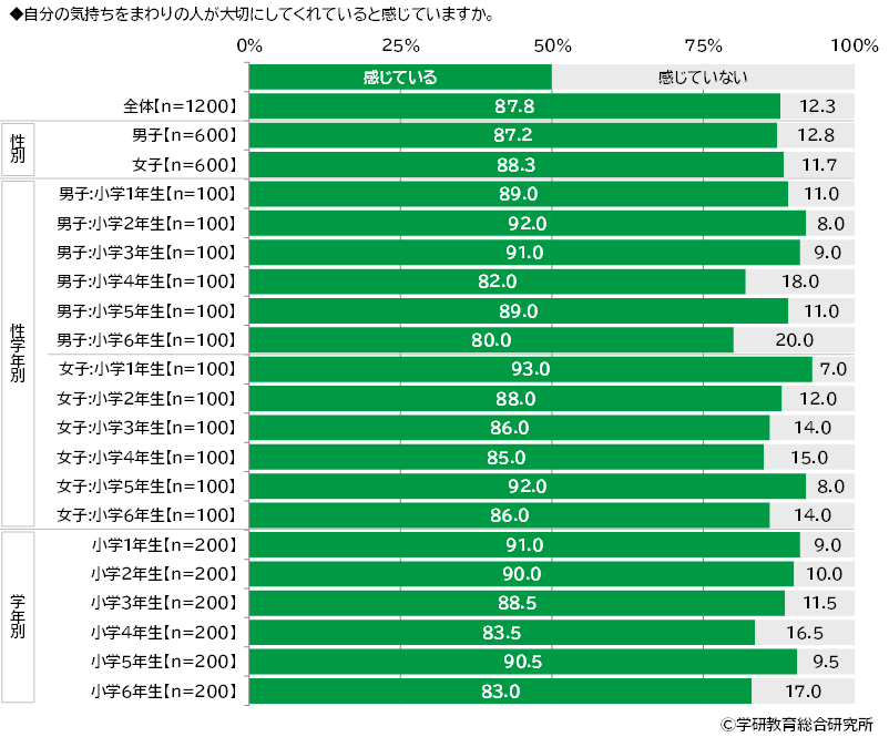 自分の気持ちをまわりの人が大切にしてくれていると感じているかをきいたところ、「感じている」は87.8%、「感じていない」は12.3%となりました。大多数の人が、自分の気持ちや考えをまわりの人から尊重・理解してもらえていると感じているようです。 男女・学年別にみると、「感じている」と回答した人の割合が最も高くなったのは、男子では2年生(92.0%)、女子では1年生(93.0%)でした。
