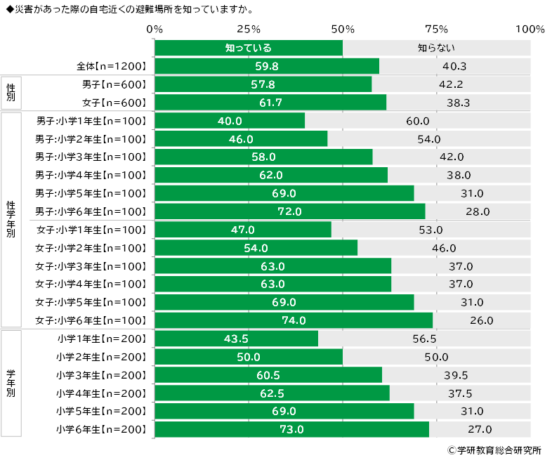 災害があった際の自宅近くの避難場所を知っているかをきいたところ、「知っている」は59.8%、「知らない」は40.3%となりました。災害発生時、どこに避難すればよいかを把握できていない人は少なくないようです。 学年別にみると、「知らない」と回答した人の割合は下の学年ほど高くなる傾向がみられ、1年生では56.5%でした。
