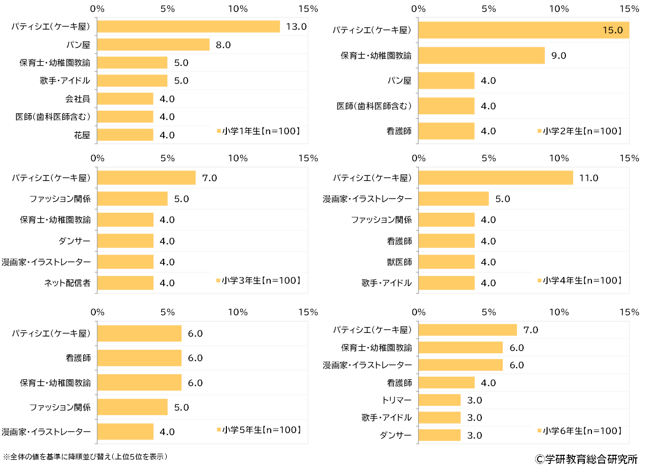 学年別にみると、いずれの学年でも1位は「パティシエ」となり、5年生では「パティシエ」と並んで「看護師」「保育士・幼稚園教諭」が1位でした。また、1年生では「パン屋」、2年生では「保育士・幼稚園教諭」、3年生では「ファッション関係」、4年生では「漫画家・イラストレーター」、6年生では同率で「保育士・幼稚園教諭」「漫画家・イラストレーター」が2位でした。