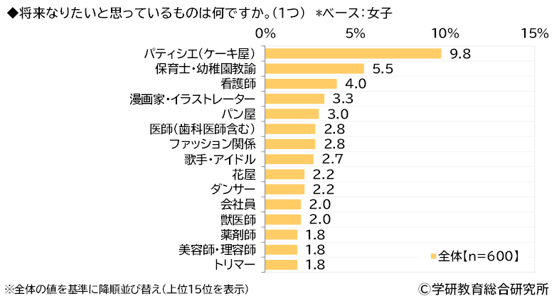 女子についてみると、1位「パティシエ」(9.8%)、2位「保育士・幼稚園教諭」(5.5%)、3位「看護師」(4.0%)となりました。
