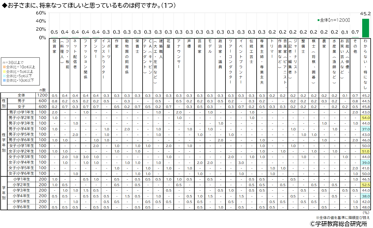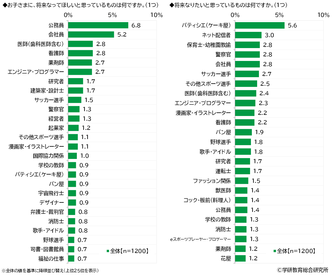 保護者に、子どもに将来なってほしいと思っているものをきいたところ、1位「公務員」(6.8%)、2位「会社員」(5.2%)、3位「医師(歯科医師含む)」「看護師」(いずれも2.8%)、5位「薬剤師」「エンジニア・プログラマー(機械・技術・IT系)」(いずれも2.7%)となりました。