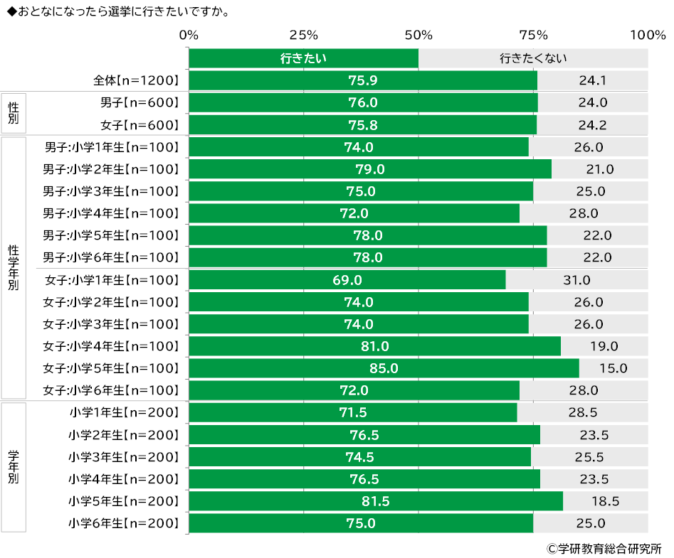 おとなになったら選挙に行きたいかをきいたところ、「行きたい」は75.9%、「行きたくない」は24.1%となりました。 男女・学年別にみると、「行きたい」と回答した人の割合が最も高くなったのは、男子では2年生(79.0%)、女子では5年生(85.0%)でした。