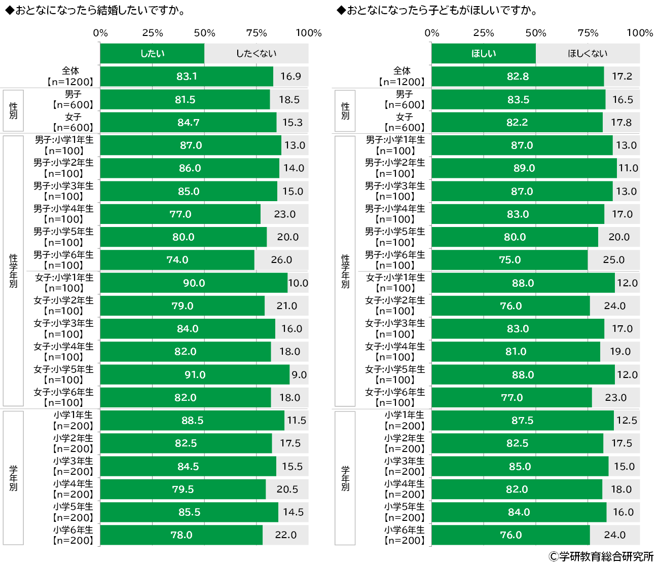おとなになったら結婚したいかをきいたところ、「したい」は83.1%、「したくない」は16.9%となりました。